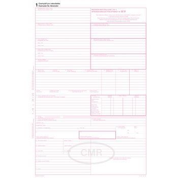 Náležitosti dle Úmluvy o přepravní smlouvě v mezinárodní silniční nákladní dopravě. Samopropisovací, číslovaný. Formát A4 na výšku. Obsahuje 5 listů odtržitelných perforací v horní části. Anglický a francozský překlad na rubové straně tiskopisu