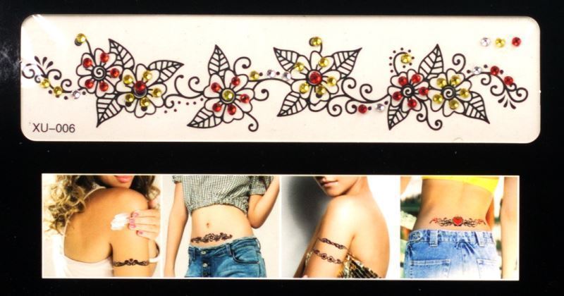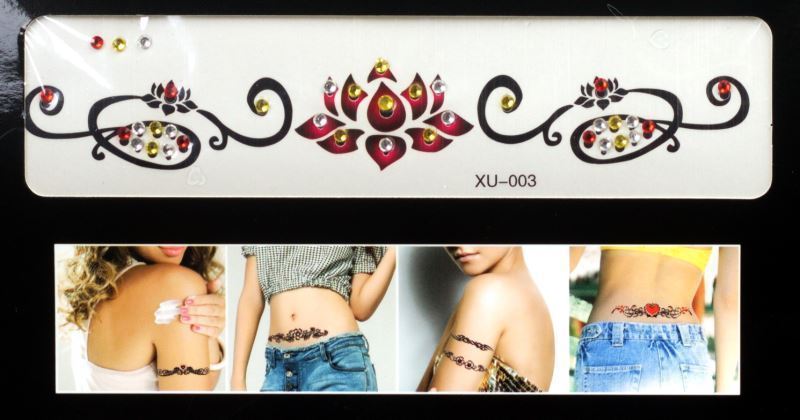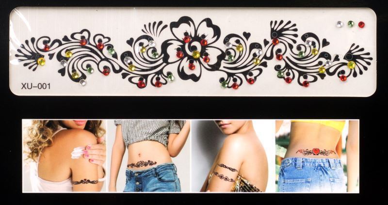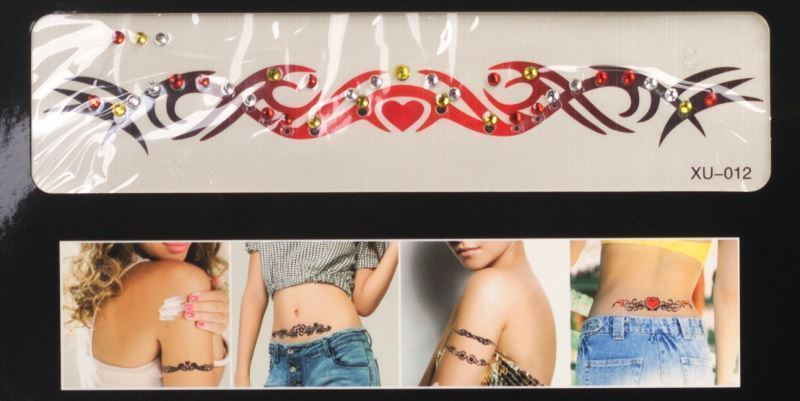 Tetování s kamínky nalepovací, mix motivů viz obrázek, vybírejte motivy dle čísel na obrázku. Štrasové kamínky skvěle doplní a rozzáří celkový efekt tetování. Nevhodné pro děti do 3 let. Obsahuje malé části.