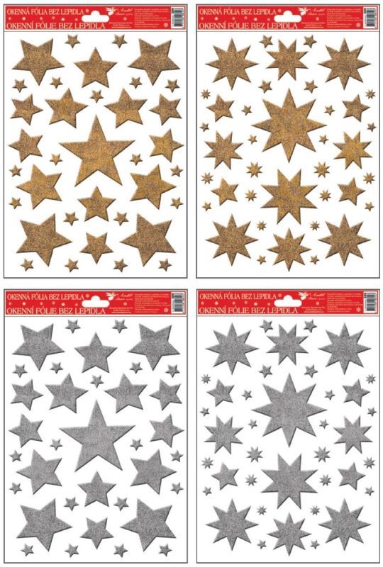 Okenní fólie hvězdy zlaté, stříbrné glitrované, velikost archu 27x20cm, cena za 1 arch.