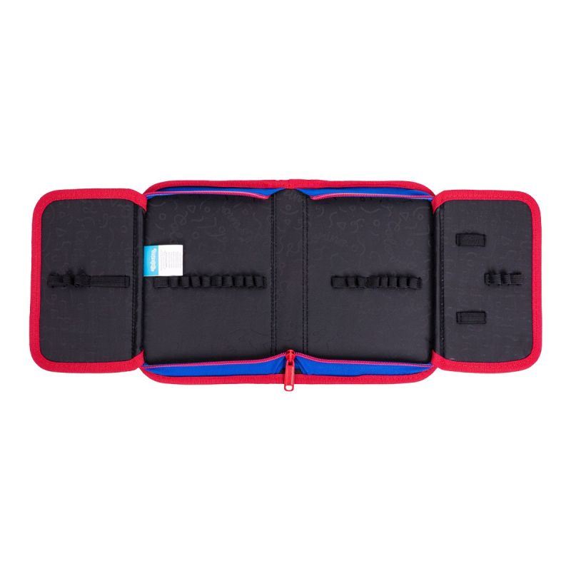 Rozkládací penál s přihrádkami na psací výbavu a jiné doplňky. Dvě postranní chlopně jsou opatřeny transparentní kapsou, chránící obsah penálu. Odolný kovový zip je sladěný s kontrastním s lemováním. Vybavení není součástí penálu.