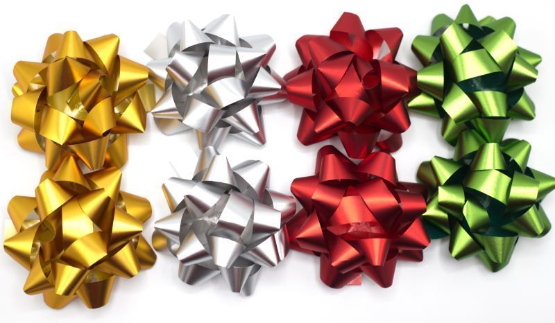Dárková rozeta matná, samolepící, velikost 9cm, mix 4 barvy, červená, zelená, zlatá, stříbrná. Balení 24ks v průhledném PP boxu, cena za 1 kus.